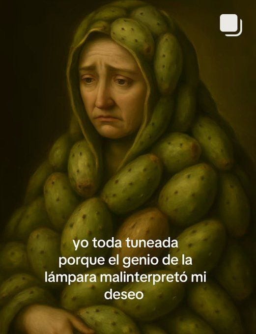 Hay todo un trend de imรกgenes AI doble sentido sobre deseos fallidos a un supuesto genio embotellado.