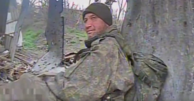 Estas imรกgenes de combate de un ruso esperando que un drone explote en medio de las ruinas del campo de batalla.