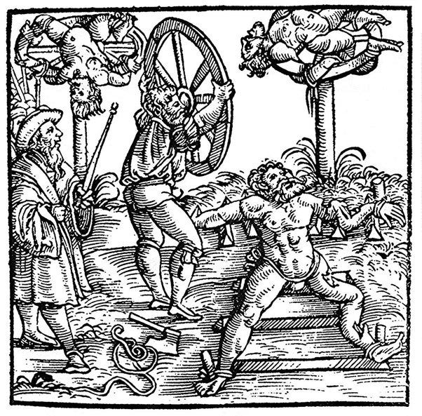 Hay gente que dirá que esto es bastante bestia, pero hasta hace un par de siglos un método de ejecución era partirles las extremidades a los sentenciados, abrirles la tripa y ponerlos sobre una rueda para que se los comieran los pájaros mientras seguían vivos. De hecho, la vaina era tan bestia e innecesaria que los sentenciados más panas eran ahorcados (ryco, uh) antes del show para que no sufrieran tanto.