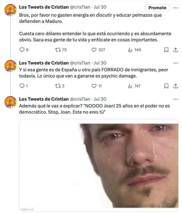 Sin embargo, hay mucho venezolano tratando de decir vainas tipo “esto no es un tema de derecha o izquierda” como si de serlo mi vida sí puede ser pulverizada y mis compatriotas puestos en peligro. No le tengo que justificar a nadie que mi sufrimiento no es moralmente aceptable. Cuesta cero dólares leer sobre el tema, preguntarle a tus conocidos y francamente no es muy complicado. Un amigo lo mínimo que te debe es empatía y entendimiento. Un amigo jamás descartaría tu opinión o tus angustias por tu color de piel o por tu clase social.