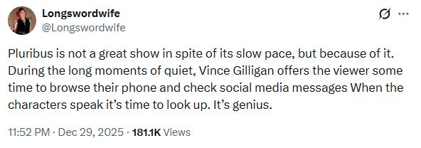 Terminé de ver la primera temporada de Pluribus y me la pasé muy bien. Creo que Vince Gillian produjo un show inteligente, ocurrente y lo único que me molesta es tener que esperar 2 años para ver otro capítulo. Quiero hablar sobre la recepción.