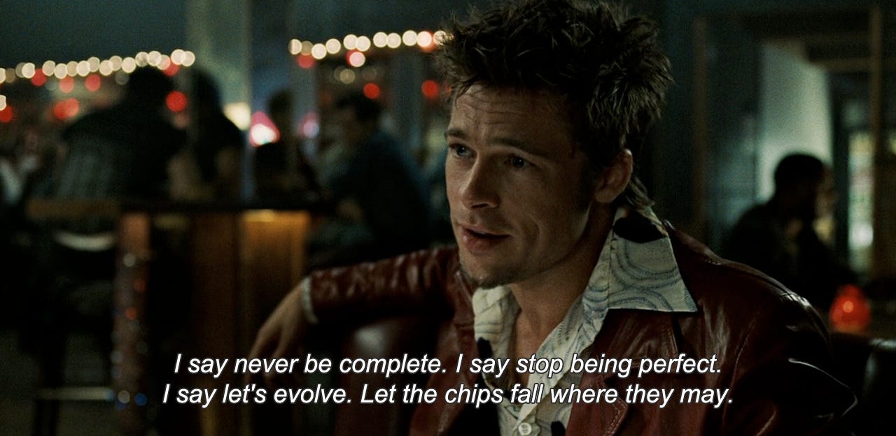La alternativa es mucho más dura. Cada persona experimenta el mundo desde su propia perspectiva y no tenemos control sobre lo que los demás piensan de nosotros. Lo mejor que podemos hacer es esforzarnos y tratar de cambiar, pero puede que ya sea muy tarde. Puede que tú ya tengas un rol y seas parte de la realidad que otras personas se han construido y no puedas cambiarlo. Incluso me puedo poner más trágico y decir que por más que trabajemos en nosotros mismos, puede que eso también sea una ilusión e irremediablemente sigamos siendo los protagonistas egoístas en nuestras cabezas. No hay una respuesta real de cómo complacer a todo el mundo. Es injusto, pero es lo que hay. Solo podemos escuchar mejor y entre líneas. O como dice Tyler: